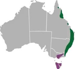The Macleay's swallowtail is one of the most widely distributed swallowtail butterflies in Australia.[8] It is found in eastern Australia including the ACT, New South Wales, Queensland, Victoria and Tasmania. It is the only swallowtail found in Tasmania.[9] The species has also been found on Lord Howe Island and Norfolk Island, but not since 1893.[1] The habitat of the species includes urban areas, forests, woodlands and heath.[10]
