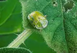 In Florida, diapause occurs in December through March, during which time the adult is dormant and hidden in leaf litter. Starting in March or April, the adults come out to feed and mate. Seven to eight generations occur during the year. The female lays single eggs on the leaves of the tropical soda apple plant.[1] A female can produce about 300 eggs.[2] Each egg is between 1 and 2 millimetres (0.039 and 0.079 in) long including its wide, transparent, papery casing. The larva emerges in 5 to 6 days, feeds voraciously, progresses through five instars, and becomes a pupa after 16 to 18 days. Pupation lasts about a week.[1] The female beetle lives 3 to 4 months.[2]