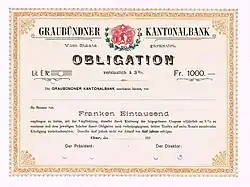 The Graubündner Kantonalbank (known as Banca Chantunala Grischuna in Romansh or Banca Cantonale Grigione in Italian) is a Swiss cantonal bank which is part of the 24 cantonal banks serving Switzerland's 26 cantons. The headquarters are located in Chur, and there are 45 branches around Graubünden.[1]