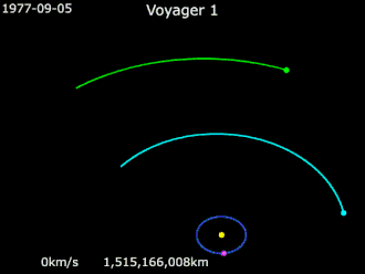 Voyager 1 was launched by NASA on September 5, 1977. It gained the energy to escape the Sun's gravity by performing slingshot maneuvers around Jupiter and Saturn.[4] Having operated for 47 years, 11 months and 9 days as of August 14, 2025 UTC [refresh], the spacecraft still communicates with the Deep Space Network to receive routine commands and to transmit data to Earth. Real-time distance and velocity data is provided[27] by NASA and JPL. At a distance of 152.2 AU (22.8 billion km; 14.1 billion mi) from Earth as of January 12, 2020,[28] it is the most distant human-made object from Earth.[29]