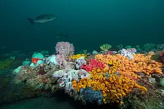 Within the 22-square-mile (17 sq nmi; 57 km2) sanctuary, there are both rocky ledges and sandy flat places. The reef's rocky sandstone outcrops, submerged beneath 60 to 70 feet (18 to 21 m) of water, can be as tall as 2 to 3 metres (6 ft 7 in to 9 ft 10 in) and are highly complex.[2] These nooks and crannies provide plenty of places for marine invertebrates to latch on to and for fish to hide in. Together these animals form a dense tapestry of living creatures that in places completely hides the rock. That gives the habitat of Gray's Reef its common name — a "live bottom".