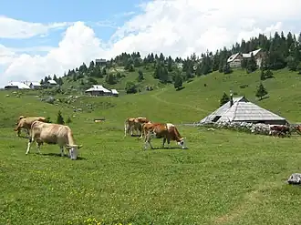 Conservation grazing is the use of grazing animals to help improve the biodiversity of a site. Due to their hardy nature, rare and native breeds are often used in conservation grazing.[19] In some cases, to re-establish traditional hay meadows, cattle such as the English Longhorn and Highland are used to provide grazing.[20]