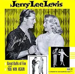 "Great Balls of Fire" is a 1957 popular song recorded by American rock and roll musician Jerry Lee Lewis on Sun Records[3] and featured in the 1957 movie Jamboree. It was written by Otis Blackwell and Jack Hammer. The Jerry Lee Lewis 1957 recording was ranked as the 96th-greatest song ever by Rolling Stone. It is written in AABA form.[4] It sold one million copies in its first 10 days of release in the United States, making it one of the best-selling singles at that time.