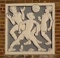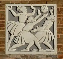The school's frontage features two carved reliefs, the left one showing three boys playing football; the right one three girls playing netball. Originally bare stone, these were painted circa 2013.