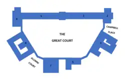 The Great Court Complex is set on the high ground in the centre of a site enclosed by Cemetery Reach, a bend in the Brisbane River, on the northern, eastern and southern sides, and St Lucia, a residential suburb, on the west. The Court, approximately semicircular in plan with eight unequal sides, is an open grassed space planted intermittently with trees and shrubs and intersected by an axially placed path. The perimeter of the court consists of a continuous colonnade that links five detached buildings, all clad in Helidon sandstone of varying colours ranging from rich purples through to creams and browns. The largest of these, forming the long northern side of the court, is really a complex of three attached buildings. It consists of the centrally located Forgan Smith Building, flanked by the Michie Building at the western end and Duhig Library to the east. The other buildings which face onto the central court are, moving around the perimeter clockwise from the Duhig Library, the Steele Building, the Richards Building, the Parnell Building and the Goddard Building.[1][4]