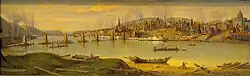 Although the flames were intense, they moved slowly enough that residents had time to remove themselves and many of their belongings. Some fled to the highlands to the east (the modern Hill District), then undeveloped except for the newly built courthouse, an area which remained untouched by the flames.[25] Of those who fled south to the Monongahela River, some were able to cross the Monongahela Bridge (located at the site of the present Smithfield Street Bridge), which connected the city to the southern bank of the river and was the first of what would be many bridges spanning Pittsburgh's rivers. However, this soon became congested, and then the wood-covered structure ignited, being fully consumed in about 15 minutes and leaving nothing but its supporting pylons.[26] Those counting on riverboats to take their belongings away fared less well because the boats that did not flee burned, leaving the refugees to pile their belongings on the riverbank.[22][27] Most of this material was burned by the advancing flames, stolen or looted, while the escaping population was typically left with nothing more than they could carry.[26][28][29] The docks and warehouses on the waterfront were likewise consumed, and as with the residences, attempts to save materials from the warehouses by bringing them to the riverbank only delayed their destruction.[30] The fire followed the river into Pipetown, an area of workers' housing and factories, again spreading destruction.[31] It only halted when the winds died down about 6:00, and by 7:00 it had fully abated within the city, having burned its way to the river and cooler hills. The factories of Pipetown burned on until about 9:00. Throughout the night, there were occasional flare-ups along with the repeated sounds of buildings collapsing.[27][32][33]