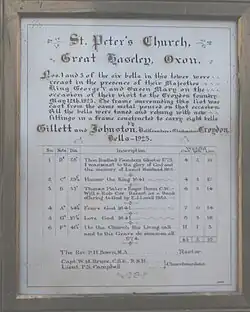 - ^ a b c Davies, Peter (13 December 2006). "Great Haseley S Peter". Dove's Guide for Church Bell Ringers. Central Council of Church Bell Ringers. Retrieved 27 January 2012.