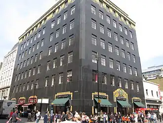 The department store Liberty is on the corner of Great Marlborough Street and Regent Street.[4] The founder, Arthur Lasenby Liberty, was unable to expand or modernise the existing shop front due to Crown planning restrictions, so he bought numerous properties on Great Marlborough Street in 1925, and rebuilt them in a Mock Tudor design as an extension of the store.[16] It was Grade II* listed in 1972.[17] Palladium House was built on the corner of Great Marlborough Street and Argyll Street in 1928 by Raymond Hood and Gordon Jeeves. It featured an Art Deco design inspired by the Paris Exhibition of 1925 and was extended in 1935. It is now a Grade II listed building.[18]