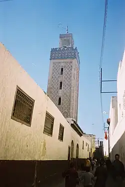 The mosque's main entrance is to the north, aligned with the mihrab (see below) at the opposite end of the building and leading into the courtyard.[3] The entrance is doubled: to the left (east) of the main gate is another gate. This resembles the arrangement of the double northern gate of the Qarawiyyin Mosque (named Bab al-Ward and Bab al-Hafa), whereby one gate featured a water channel which allowed visitors to wash their feet as they entered, while the other gate was a regular entrance.[3][2][9] However, it seems likely that in this case the second gate was designed to give direct access to a walled-in gallery section in the northeastern corner of the courtyard which was reserved for women coming to pray.[2][4]