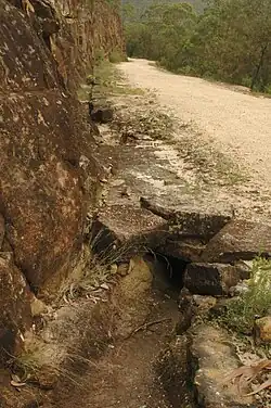 Cutting made by convict workers who would hammer a crowbar-like 'jumperbar' into the rock, fill the hole with gunpowder, plug the hole and ignite it; visible are metre-long 'half holes' that remained after the rock face was blown away -