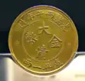 In the year Guangxu 29 (1903) the Ministry of Revenue in Beijing had authorised a small number of gold 1 Kuping tael Guangxu Yuanbao pattern coins with the English inscription "29TH YEAR OF KUANG HSÜ - HU POO", the dies for these coins were probably produced at the Japan Mint in Osaka, Japan.[7] In the year Guangxu 30 (1904) the Ministry of Revenue created a concrete implementation for the manufacture of gold coins,[8] while in Guangxu 31 (1905) the government of the Qing dynasty reformed the currency system to allow for gold coins, these would be cast by the Tianjin General Mint operated by the Ministry of Revenue with the inscription "Great Qing Gold Coin" (大清金幣),[9] These coins bore a similar inscription to the copper-alloy Great Qing Copper Coin (大清銅幣)[10][11] and the silver Great Qing Silver Coin (大清銀幣), which were both introduced to standardise the national coinages in their respective metals.