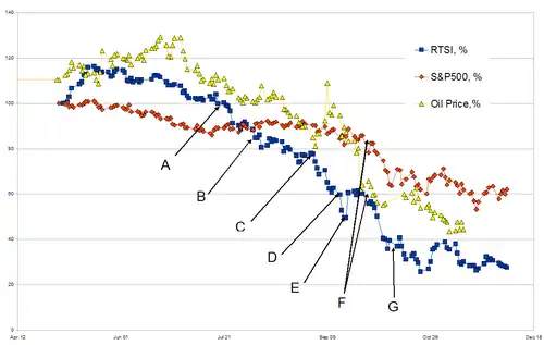 - ^ "UPDATE 1-Russian stocks suspended in worst plunge since 1998". Reuters. 16 September 2008. Archived from the original on 19 September 2008. Retrieved 12 October 2008.
