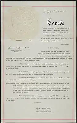 The governor general of Canada is officially charged with custody of the Great Seal.[4] The governor general is presented the Great Seal of Canada during their swearing-in ceremony.[5] During the same ceremony, the registrar general of Canada becomes the keeper of the seal, and maintains day-to-day custody over it.[4] Although the Great Seal is the governor general's seal, the Seals Act of 1939 allows the sovereign to use it in place of the Great Seal of the Realm for any Canadian royal instrument.[3][a]