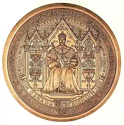 Including the temporary seal issued in 1867, there have been eight Great Seals of Canada, one for each monarch of Canada, except for Edward VIII, who abdicated before a seal could be produced.[10] Following British tradition, Canada customarily continues to use a late monarch's Great Seal after their death, until a new one is issued in the name of the reigning sovereign.[10] Only Queen Victoria and King George VI had two Great Seals issued in their name. The 1867 temporary Great Seal was issued in Victoria's name before a permanent one entered use in 1869, and a second seal was issued for George VI after he relinquished the Emperor of India title in 1947.[10]