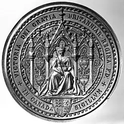 The first Great Seal of Canada, a temporary seal issued in Queen Victoria's name, came into official use on 1 July 1867. It featured the royal arms of the United Kingdom and the Latin inscriptions VICTORIA D · BRITT · REG · F · D (transl. Victoria, by the Grace of God Queen of Great Britain, Defender of the Faith) and SIGILLUM CANADÆ (transl. Seal of Canada). The base of the seal, extending upward to the motto, displayed the rose of England, an Irish shamrock, and the Scottish thistle.[19] The temporary seal was originally intended for use only a few months, but disagreements over the design of its replacement delayed its defacement until 1869.[20] At 80 millimetres (3.1 in), the temporary Great Seal was smaller than subsequent Great Seals, and was made out of copper.[18]