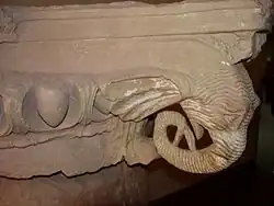 Among the most spectacular finds discovered through excavation are two largely intact elephant-headed capitals, with four heads in place of an Ionic capital's volutes. These were found near the Lower Temenos in 2000, with 328 fragmented elephant-head elements found in total.[7] In addition to the capitals, excavators found eight limestone relief panels depicting male and female busts, speculatively identified as in reference to Apollo/Ares, Aphrodite/Amazon, Tyche/Fortuna, and others.[8]