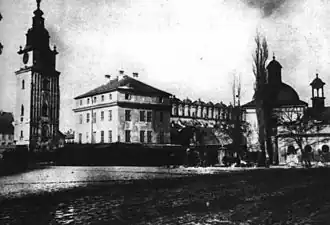 ![]() Historical photograph of the Great Weigh House, as seen from the Grodzka Street, with Town Hall Tower (left) and St. Adalbert (right) |