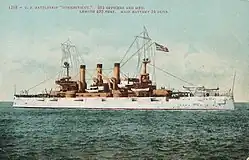 The Fleet, First Squadron, and First Division were commanded by Rear Admiral Charles S. Sperry.[35] First Division consisted of Connecticut, the Fleet's flagship, Captain Hugo Osterhaus; Kansas, Captain Charles E. Vreeland; Minnesota, Captain John Hubbard; and Vermont, Captain William P. Potter.