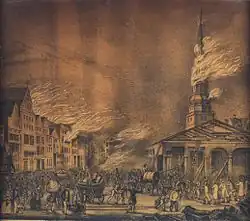 As the fire continued to burn, collapsed buildings prevented fireboats from using the canals, and there was no system to coordinate the firefighters from different parishes.[6] Firefighters from outside the city, as far away as Lübeck and Kiel, joined the effort. Some buildings were blown up in an attempt to create firebreaks, including the old Rathaus (city hall), originally built in 1290; 18 wagonloads of records were salvaged from it first.[2][7][8] 5 May was Ascension Day; a few hours after the midday feastday service, despite strenuous efforts, the spire of the Nikolaikirche collapsed, and the church burned down.[2][9] There was panic and extensive looting; the militia aided in the firefighting until it had to combat looting instead.[2] About half the population, some 70,000 people, fled.[7]