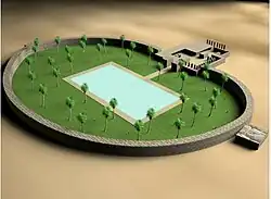 The earliest inscription found about the gardens' massive enclosure was by Mukarrib Yada`'il Dharih I in the 7th century BCE.[3] The enclosure is defined by a massive oval shaped wall, measuring approximately 757 m long and 13 m high; however the original height length can't be determined for certain.