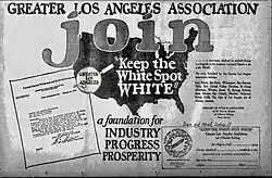 Organized with a great burst of energy in 1924, the group proper fizzled within a couple of years.[3][1] However, over time, their phrase the white spot of America became a general descriptor for the Los Angeles area, with its attendant racial and political insinuations.[4][5] Originally intended to market the city's (and Harry Chandler's) aggressively "open shop" approach to labor relations,[6]: 82 it came to be applied by both proponents and detractors to policies like racial covenants restricting housing.[7]