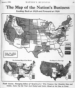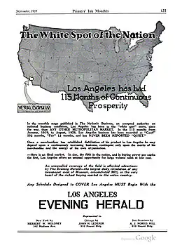 The Greater Los Angeles Association was a 1920s civic-booster group of California, United States that promoted business interests in the area under the slogan "keep the white spot white".[1][2] The slogan referenced monthly maps published by the U.S. Chamber of Commerce magazine Nation's Business that used different colors to indicate different levels of commercial activity—spots with good levels were colored white.