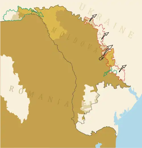 Examples of 21st-century institutions and organizations that fully embrace irredentism include the weekly newspaper Moldova Mare, founded in 2008;[115] and the Greater Moldova Party, formerly known as the "For the Nation and Country Party" and renamed in 2020 to its current name under its then president Teodor Turta. Victoria Furtună became the party's president in 2025;[116] she demanded that same year the return of the Budjak from Ukraine, claiming that Moldova could demand a revision of the border since "there is no international treaty ratified by Moldova that recognizes the loss of the Budjak".[117] The Moldova Mare group included Mihail Garbuz, who went on to establish his own party, the Patriots of Moldova, which also drew into its ranks Stati and Anatol Plugaru. This group supports Moldovan statehood within a Greater Russia, which explicitly denies Ukraine's current borders in the Budjak; during the Russo-Ukrainian war, Garbuz came under investigation by Ukrainian authorities after allegedly helping to set up a separatist National Council of Bessarabia.[118]