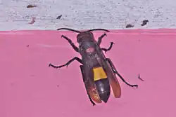 The workers of Vespa tropica are about 24–26 millimetres (15⁄16–1 in) in length, while queens grow to 30 millimetres (1+1⁄4 in). The head is dark brown/red; the abdomen is black with a distinct yellow stripe which covers most of the second abdominal segment. However, there is some variation across its range and in Singapore and southeastern Asia, specimens are often completely black and larger in size, while in other regions such as Hong Kong, the head and flanks of the thorax are normally reddish.[1][2] A third colour form is found in the Andamans and Nicobars, which has a reddish brown head and thorax and all the dorsal plates on each segment of the gastrum are orange except the first.[3]