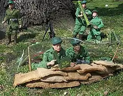Mattel toys made "Guerrilla Fighter" playsets in 1962 containing a commando green beret with an interesting tin "Guerrilla Fighter" badge depicting the crossed arrows insignia of the Special Forces, (formerly worn by the 1st Special Service Force, and before that the U.S. Army Indian Scouts) and a jungle knife in front of a parachute. The set also contained the Mattel Dick Tracy automatic cap firing "tommy gun" or "Scattergun" (the Dick Tracy cap firing but no longer water firing riot shotgun) toy guns, both now in military camouflage plastic, a military camouflaged poncho, and in some sets, a rubber Ka-Bar knife and a tripwire booby trap. Mattel later made the "M-16 Marauder", in 1966, which appeared in The Green Berets film wherein an enraged John Wayne smashes one against a tree.