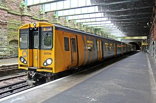 As of 27 December 2023, trains operate every 30 minutes between Liverpool and Ellesmere Port, and every 15 minutes between Liverpool and Chester.[3] Northbound trains operate via Birkenhead Hamilton Square station in Birkenhead and the Mersey Railway Tunnel to Liverpool. Southbound trains travel towards Hooton, where the lines to Chester and Ellesmere Port divide. These services are provided by Merseyrail's fleet of Class 777 EMUs.