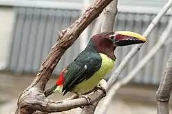 The green araçari (Pteroglossus viridis), is a toucan, a near-passerine bird. It is found in the lowland forests of northeastern South America (the Guiana Shield), in the northeast Amazon Basin, the Guianas and the eastern Orinoco River drainage of Venezuela. At 30–40 cm. (12–16 in) long and weighing 110–160 grams (3.9–5.7 oz.), it is the smallest aracari in its range,[3][4] and among the smallest members of the toucan family.