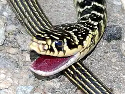 Commonly regarded as non-venomous, it is described that a subject who endured 'sustained biting' of up to 5 minutes began showing suspect symptoms, including problems with neuromotor skills.[5] The presence of modified rear maxillary fangs in correspondence to a gland called the Duvernoy's gland, similar to the venom gland and involved in the production of toxins, has recently been discovered.[6]