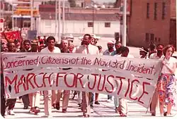 On November 3, 1979, members of what would become the Communist Workers Party (CWP) held an anti-Ku Klux Klan rally at the Morningside Homes public housing project.[50] Four local TV news stations covered it. During the protest, two cars containing Klansmen and neo-Nazis arrived.[51] After a confrontation, the KKK and CWP groups exchanged gunfire. Five CWP members were killed. Eleven CWP members and one Klansman were injured.[52] Television footage of the actions was shown worldwide, and the event became known as the Greensboro massacre. In November 1980, six KKK defendants were acquitted in a state criminal trial by an all-white jury after a week of deliberation. Families of those killed and injured in the attack filed a civil suit against the city and police department for failure to protect citizens. In 1985, a jury in this case found five police officers and two other individuals liable for $350,000 in damages; the monies were to be paid to the Greensboro Justice Fund, established to advance civil rights.