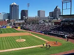 The Greensboro Coliseum Complex[22] hosts a variety of major sporting events, concerts, and other events, including the ACC men's basketball tournament and women's basketball tournament. Local professional teams include the Greensboro Grasshoppers of the South Atlantic Baseball League,[23] the Greensboro Swarm of the NBA G League,[24] and the semi-professional Carolina Dynamo soccer club of USL League Two. Amateur teams include Greensboro Roller Derby and college teams in four NCAA programs. The Sedgefield Country Club is currently host to the annual PGA Tour event Wyndham Golf Championship. Greensboro would serve as the Atlantic Coast Conference headquarters for 70 years, until the league relocated to Charlotte, North Carolina, in 2023.[25][26][27]