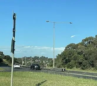In the late 1980s, the northern section of Greensborough Road south of Grimshaw Street was extended and significantly altered, with the original road north of Lenola Street in Macleod re-aligned to the west as a service road, the new road being a divided highway up to a new intersection at Grimshaw Street. North of here the road was extended as a single carriageway bypass road, sweeping north-west around central Greensborough and terminating at a large roundabout interchange with Diamond Creek Road and Civic Drive, known locally (and sign-posted) as the Greensborough Bypass. The original alignment north of Nepean Street was repurposed for local traffic only, still known today as Greensborough Road.[6] Construction on the northern half, the 3 km section between Grimshaw Street and Diamond Creek Road, started in 1985[7] and opened in March 1988;[8] construction on the southern half, the 2 km section between Grimshaw and Lenola Streets, started in late 1985,[9] and opened in September 1989.[10]