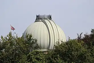The Greenwich 28-inch refractor is a telescope at the Royal Observatory, Greenwich, where it was first installed in 1893. It is a 28-inch ( 71 cm) aperture objective lens telescope, otherwise known as a refractor, and was made by the telescope maker Sir Howard Grubb. The achromatic lens was made Grubb from Chance Brothers glass.[1] The mounting is older however and dates to the 1850s, having been designed by Royal Observatory director George Airy and the firm Ransomes and Simms.[2][1] The telescope is noted for its spherical dome which extends beyond the tower, nicknamed the "onion" dome.[3] Another name for this telescope is "The Great Equatorial" which it shares with the building, which housed an older but smaller telescope previously.[4]