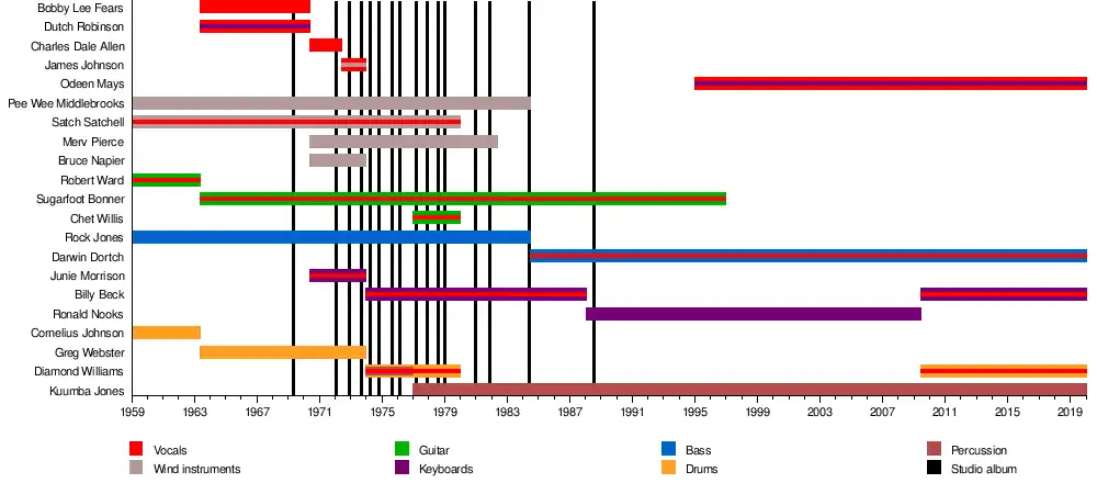 - Clarence "Satch" Satchell – baritone saxophone, tenor saxophone, soprano saxophone, alto saxophone, flute, percussion, lead and background vocals (1959–1980)