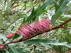 Grevillea barklyana was first formally described in 1870 by George Bentham in Flora Australiensis from an unpublished description by Ferdinand von Mueller.[4][5] Mueller had previously published the name in 1861 in the Votes and Proceedings of the Legislative Assembly of Victoria, but the name was a nomen nudum.[6] The specific epithet honours Sir Henry Barkly who was Governor of Victoria between 1856 and 1863.