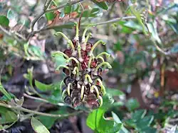 Grevillea floripendula, commonly known as Ben Major grevillea[3] or drooping grevillea,[4] is a species of flowering plant in the family Proteaceae and is endemic to a restricted area of Victoria, Australia. It is a spreading, low-lying to prostrate shrub with divided leaves with toothed lobes and clusters of greenish to mauve and blackish flowers with a yellow to red style.