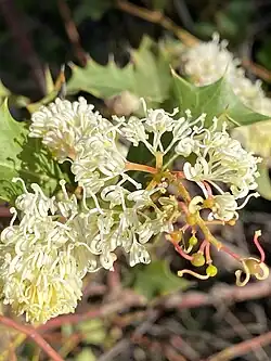 This species was first formally described in 1839 by John Lindley, who gave it the name Anadenia aquifolium in A Sketch of the Vegetation of the Swan River Colony.[4][5] In 1848, Carl Meissner moved it to the Grevillea genus, but since the name Grevillea aquifolium was unavailable, having been used for a different species, changed the name to Grevillea monticola in Johann Georg Christian Lehmann's Plantae Preissianae.[6][7] The specific epithet (monticola) means "a dweller in mountains".[8]