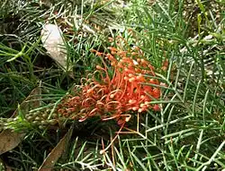 - Grevillea nana C.A.Gardner subsp. nana[10] has leaves with 5 to 13 lobes that are 20–130 mm (0.79–5.12 in) long and 1.1–1.4 mm (0.043–0.055 in) wide, and creamy-green or greenish-pink to scarlet flowers with a purplish, red or pale orange style from June to October.[11][12]