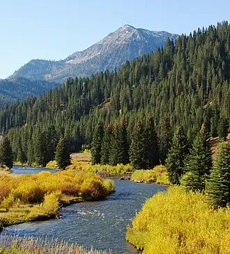 The Greys River is a tributary of the Snake River, flowing through western Wyoming in the United States. The river is about 62 miles (100 km) long,[1] starting high up in the Wyoming Range, 45 miles (72 km) south of the town of Alpine in Lincoln County. The river eventually flows into the Snake River in the Snake River Canyon, joining it just east of Alpine.[2] The Greys River is generally a rushing mountain stream that separates the high Wyoming Range (east) from the Salt River Range (west). It joins the Snake River just above the intersection of U.S. highways 89 and 26. Just a short distance downriver from the confluence of the two rivers, the Snake widens quickly and passes through Alpine and enters the Palisades Reservoir. The largest tributary of the Greys River is the Little Greys River. At Alpine, Wyoming, the Greys River measures 654 cubic feet per second average. With a 180 cuft/s min. and a 3,004 max.[3]
