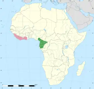 The grey-necked rockfowl is found in West Africa from southeast Nigeria to southwest Gabon.[21] In Nigeria, it is only found in the nation's southeastern corner near the coast and the Cameroon border.[4] The species is widespread in southwestern Cameroon, and this country is considered to be the species' stronghold.[22] It is found throughout Equatorial Guinea and into southwestern Gabon.[21] Additionally, the species resides in the southwestern forests of the island of Bioko in the Gulf of Guinea.[4] There is only one record of this species from the Republic of the Congo, though it is suspected that the rockfowl may have an undiscovered population in this country.[3][9] The grey-necked rockfowl's total range covers approximately 314,000 square kilometres (121,000 sq mi).[21]
