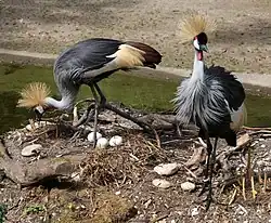 Grey crowned cranes time their breeding season around the rains, although the effect varies geographically. In East Africa the species breeds year-round, but most frequently during the drier periods, whereas in Southern Africa the breeding season is timed to coincide with the rains.[4] During the breeding season, pairs of cranes construct a large nest; a platform of grass and other plants in tall wetland vegetation.