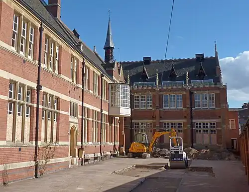 The former Alderman Newton's Boys School. The furthest section is the original school, with extensions along the left side. Trench 3 of the 2012 dig can be seen in the former playground.