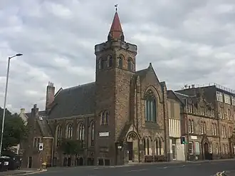 The Kirk o' Field building was constructed in 1912 to a design of James Bow Dunn, which imitates the late Scottish Gothic style. The front elevation centres on a curvilinear traceried window and is flanked by a short steeple with a red-tiled spire and a corbeled, battlemented parapet.[5][35][36] From 1956, the church possessed a speaker system to play recorded bell music from the tower. This ceased during the following decade.[37] Next door are the St Ninian's Mission buildings with a hall to the rear, which initially served as the mission church.[5][2] The St Ninian's Mission buildings were designed by Robert Wilson and were opened in 1891. The former church officer's house stands on Brown Street behind the former Kirk o' Field building.[5]
