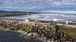The Greymouth Bar is a sandbar at the mouth of the Grey River. It is notorious in New Zealand and more than 44 ships have been wrecked there while entering, leaving or mooring in the harbour.[33] The first shipwreck happened on 13 September 1863 when the schooner Gipsy carrying mostly gold diggers from Sydney, was caught in a northeasterly gale.[33] Sixteen lives have been lost since 1865, when the Nugget drifted out of the river and across the bar at night.[33] The cutter was half full of water when the crew came on deck and only one of the two crewmen made it safely to shore.[33]