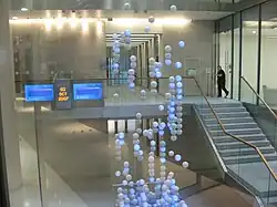 Throughout the day the sculpture responds to reputable news feed and displays snapshots of the current headlines, written in full height of the atrium. At the end of each day's trading the spheres return to their cubed arrangement, resting on the sculpture's base, and blue lights inside each sphere are illuminated to show the stock market's closing price with an arrow to indicate how the market performed on that particular day. Her Majesty Queen Elizabeth II unveiled the sculpture on 27 July 2004[2] and the opening was broadcast to a global audience. The installation is broadcast every morning on television to an estimated global audience of 80 million people.[3][4] It was nominated for an Interactive BAFTA award in 2005.