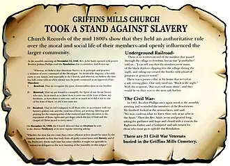 Additional anti-slavery sentiment was evident through documented visits by Sojourner Truth, who was an African-American abolitionist and women's rights activist. Although born into slavery in Swartekill, Ulster County, New York, she escaped to freedom in 1826. While living in Massachusetts in the 1840s, she fraternized with the likes of William Lloyd Garrison, Frederick Douglass, and David Ruggles. Truth started dictating her memoirs to her friend Olive Gilbert, and in 1850 William Lloyd Garrison privately published her book, “The Narrative of Sojourner Truth: A Northern Slave”. At William Lloyd Garrison's suggestion, Truth accompanied the English abolitionist George Thompson on a lecture tour through western New York and Ohio so that she might have the opportunity to sell her book at twenty-five cents a copy. It was on this tour that she first lectured at Griffins Mills Church. Sojourner Truth visited again on October 1, 1868.[7]