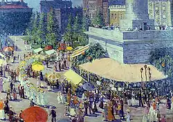 In the post-war years, he travelled throughout the Northeast, spending much of his time in New York and Connecticut. Eventually, in 1922, he settled in New York City. There, he painted portraits and murals and became a member of the National Society of Mural Painters. Numerous companies and organizations commissioned murals from him; including Lee, Higginson & Co. and the Brooklyn Borough Gas Company. His works may be seen at the Metropolitan Life Insurance Company Tower, the Criminal Courts Building, and the City Bank Farmers Trust Building. In 1932, together with the stained glass artist, Robert McGill Mackall (1889-1982), he decorated the Baltimore Trust Company Building.[2]